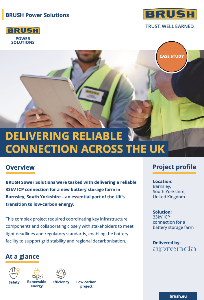 Often working in partnership with Distribution Network Operators (DNOs), BRUSH Power Solutions is able to deliver at every stage of a project’s lifecycle. From initial design and consultancy through to construction, testing, commissioning and connection, the team are on hand to provide comprehensive end-to-end HV infrastructure solutions for projects from 11kV to 400kV.